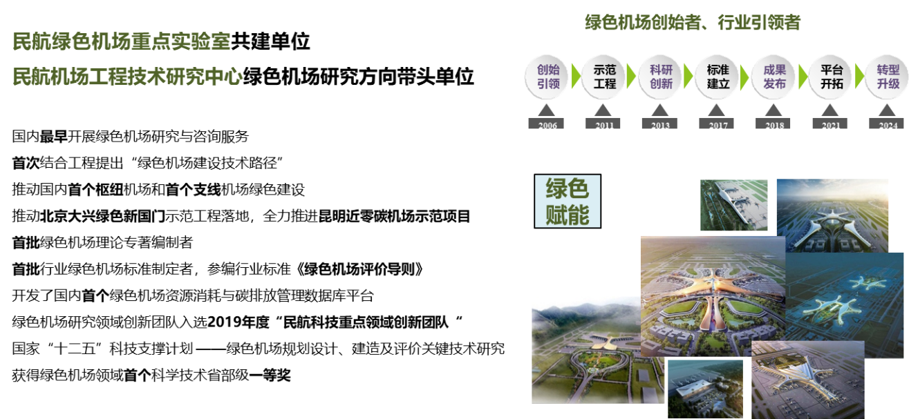 作为绿色机场创始者、行业引领者,绿色低碳中心于2006年开展绿色机场领域研究,始终致力推动机场绿色节能、低碳环保,促进民航高质量发展。指导推动了我国首个绿色机场、首个绿色支线机场以及绿色新国门的绿色示范建设,代表性的绿色机场工程案例包括昆明长水、北京大兴、成都天府、西安咸阳、青岛胶东、兰州中川、上饶三清山等;先后完成或参与了十余项国家级、省部级科研项目和多部行业绿色机场建设标准,多人入选2019年度民航科技重点领域创新团队——绿色机场研究领域创新团队;2021年成为民航机场工程技术研究中心绿色机场研究方向带头单位,2022年成为民航绿色机场重点实验室共建单位。