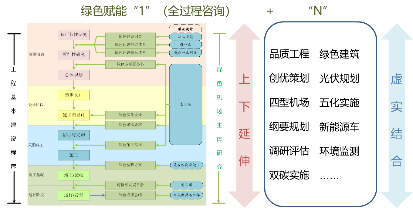在绿色机场建设领域,我们秉持“1+N”模式,以基本建设程序为轴心,全方位拓展品质工程、绿色建筑、创优策划、四型机场、调研评估、五化实施、纲要规划、光伏规划、“双碳”实施、新能源车、环境监测等多元工作,形成上下延伸、虚实结合的立体化工作体系。