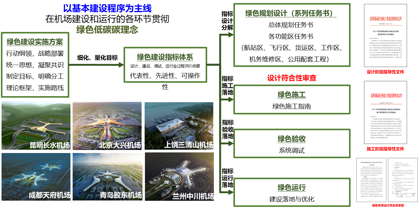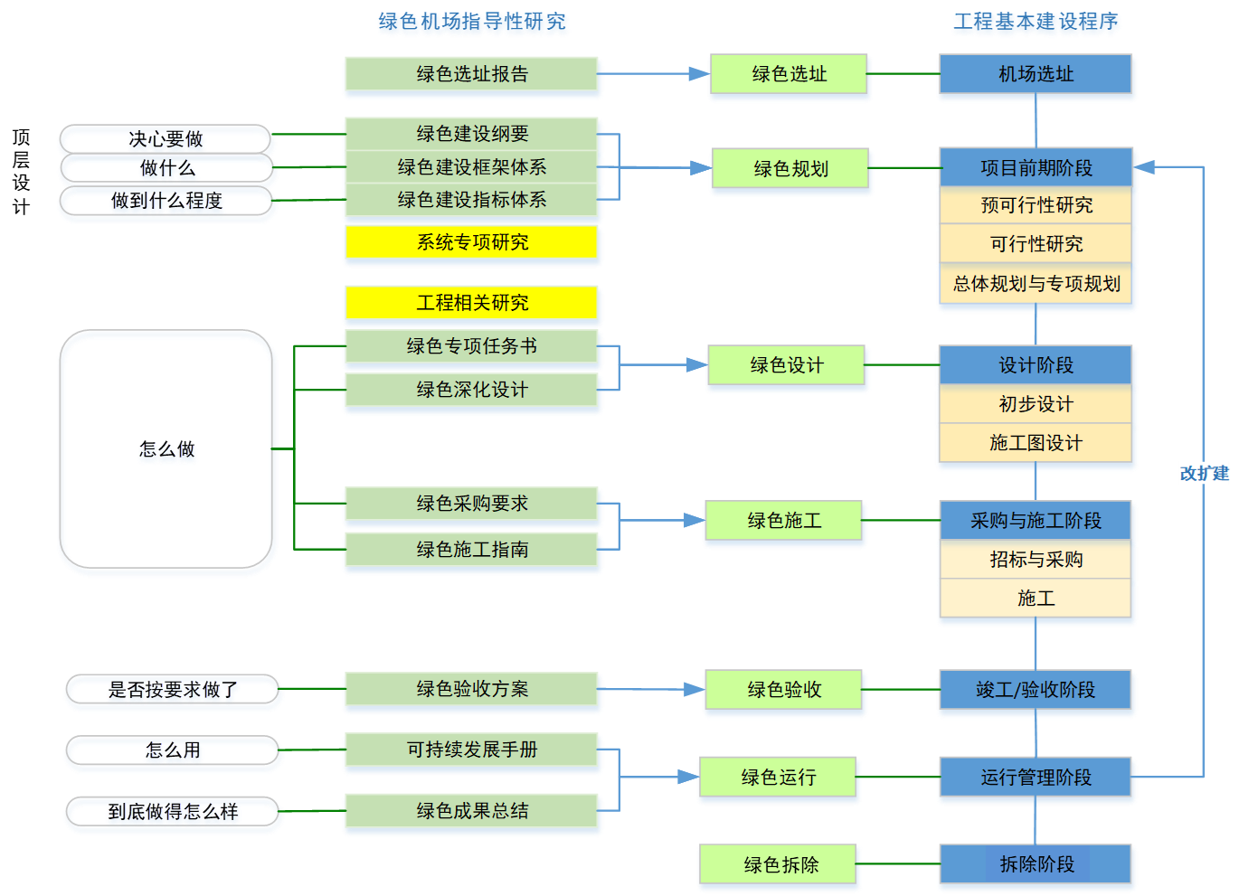 绿色机场主体研究是一系列绿色机场建设指导性文件的有机整体,其围绕机场基本建设程序,遵循着从决心要做→应该做什么→做到什么程度→怎么做→是否按要求做了→怎么用→到底做得怎么样的一套完整流程循序渐进,贯彻落实绿色机场理念。