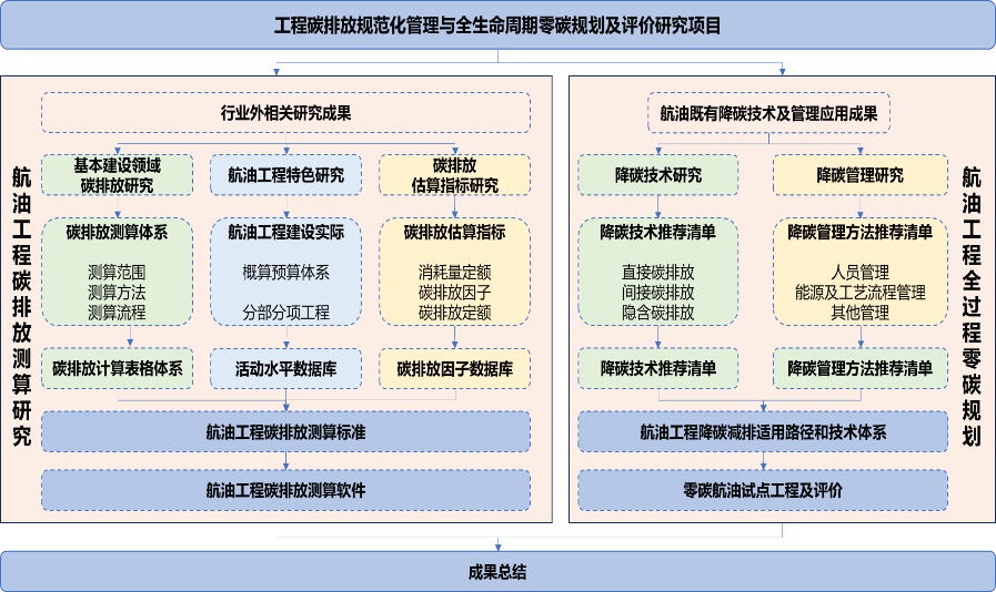 项目旨在为航油工程建设与运行提供碳排放管理的理论支撑和技术支撑,建立规范化、可操作的航油工程碳排放测算方法和碳排放定额标准,形成航油工程零碳建设的适用路径和技术体系,支撑航油工程碳排放管理及评价考核等,助推中国航油成为世界一流航空能源保障领域绿色低碳发展引领者。围绕航油工程建设及运行期碳排放测算、航油工程建设运行全过程零碳规划实施路径、航油工程零碳试点与评价开展工作。